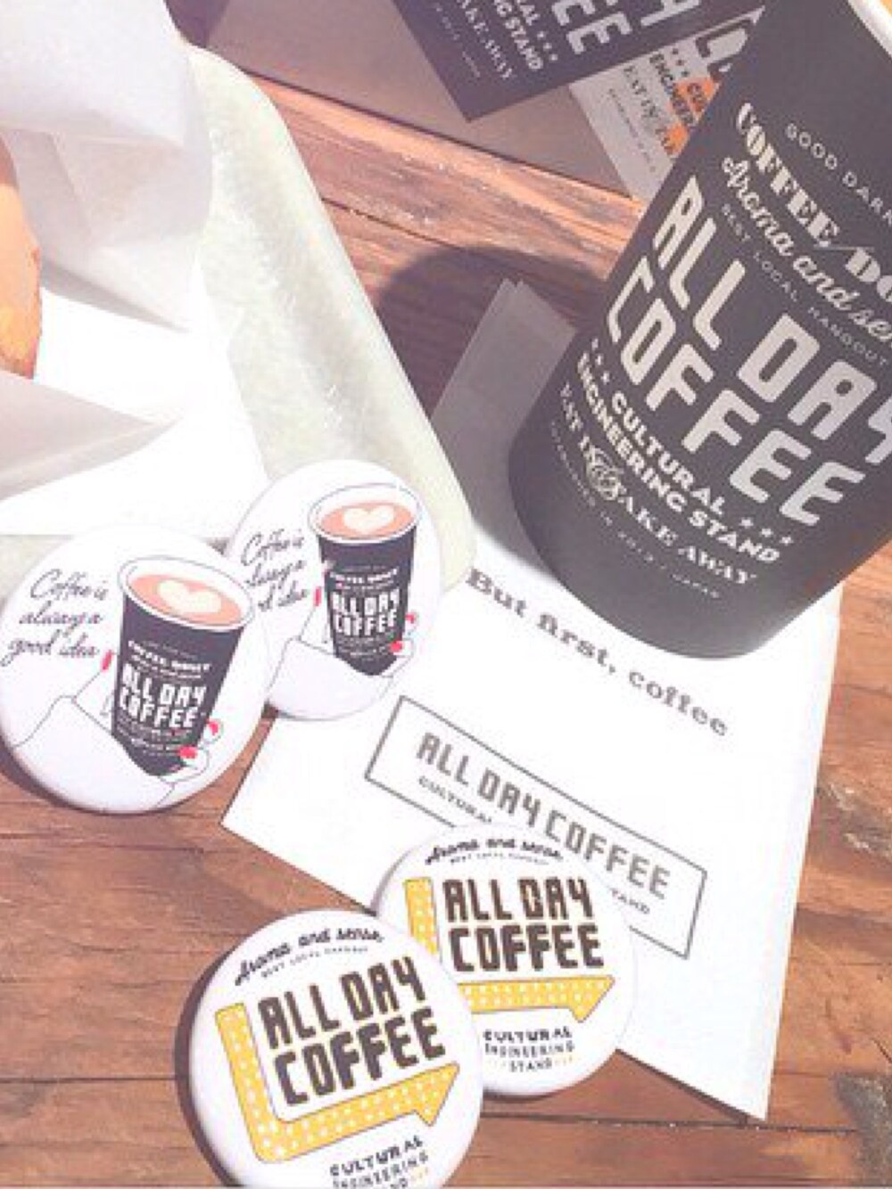ごめんなさい! かわいーのが出来上がったのでお披露目です♡ ALLDAYCOFFEEはトートバッグだけじゃなく缶バッジもかわいーですよー♡ NEWデザインひと粒どーぞ♡