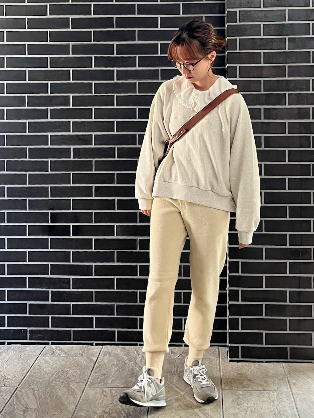 淡色でまとめた日🥣 このニットパンツあったかいしシルエットスッキリでお気に入りです⭐️ ニューバランスのぽってり感とニットパンツの足首のバランスが絶妙でポイント❣️ フリルブラウスとかガーリーなアイテムが1個あると雰囲気変わるから選びがち〜🫢