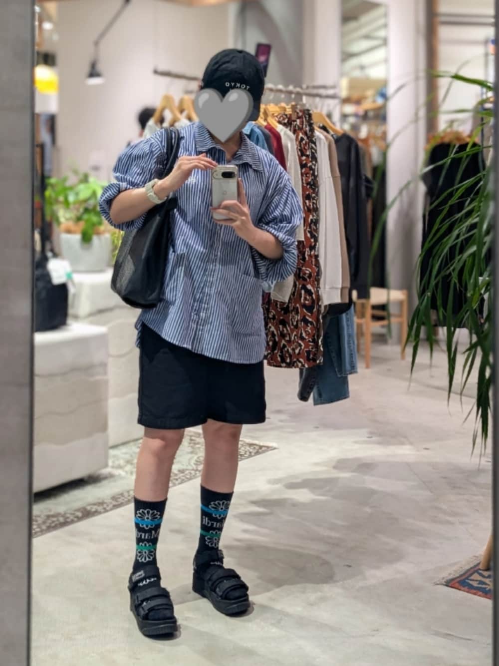 もう少しシャツ丈長いほうが良いのかな?羽織りとして使うほうが良いのかも ポッケついてるし生地もしっかりめでお気に入りのストライプシャツ 最近太ったからデニムのお腹が苦しい、、、、