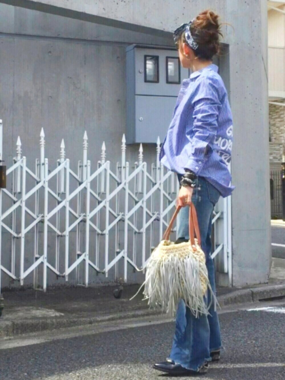 一目惚れしたシャツ♡ クールなデザインのデニムのワイドパンツ👖 ネイビーのバンダナヘアバンドにお団子🍡 先日は目黒川でお花見🌸 Yosaさん、B.ちゃん、Yukieちゃん、Creamちゃんの素敵すぎるメンバー♡ カフェのケーキも美味しかったし、ご飯も美味しかった♩ 貴重な時間をありがとうございました〜🙋✨