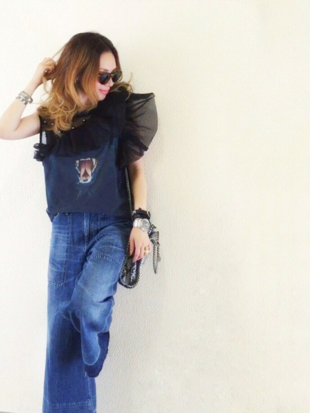 古着Tのリメイクで、ブラックビーズやパールの刺繍が加えてあるトップス♡♡⋆* デザインある1点モノに弱い… デニム合わせ💪