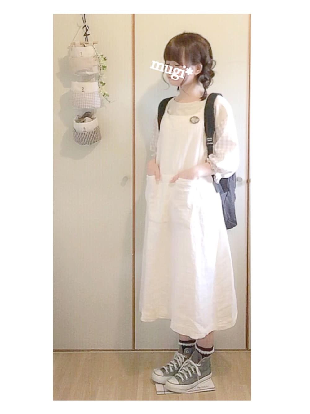 今日は エプロンワンピ * 安定の白です 。 ナチュラルなワンピに カジュアルな小物の組み合わせが すごい好きです ( ˆoˆ ) ♡