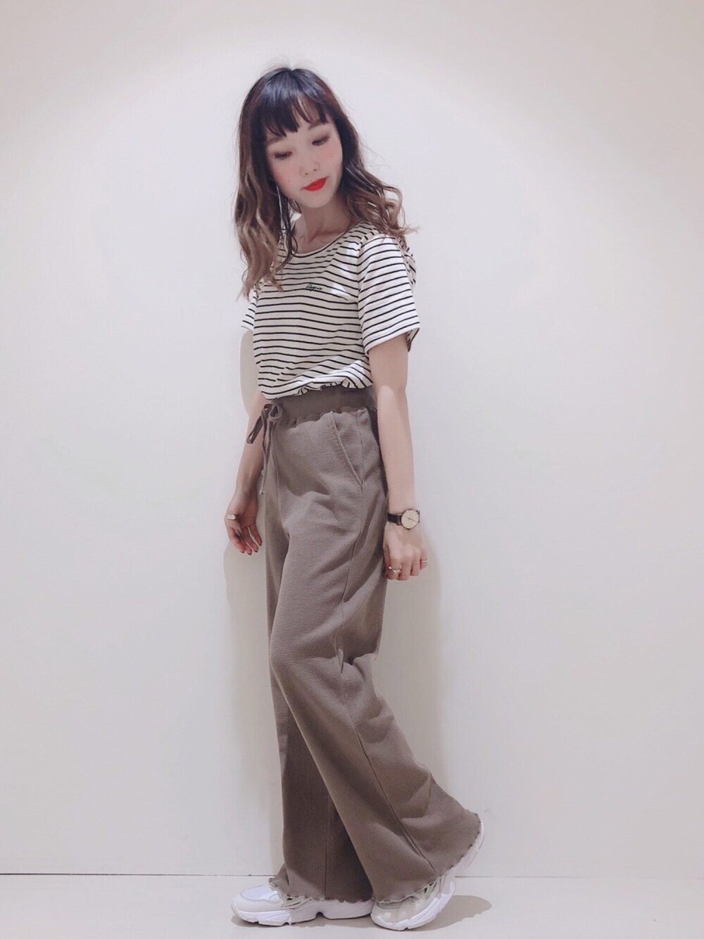 earthのワッフルワイドパンツは カジュアル過ぎず シルエットもすごく綺麗なので 脚長効果も抜群 ✨ ベージュカラーは今年らしく着ていただけマス 🤞🏻🐻💕