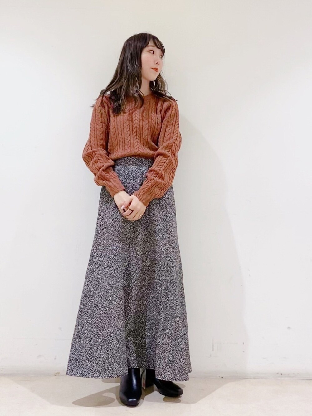 スカートは小花柄でガーリーすぎず使えるのでおすすめ🌼 ブーツで大人きれいめコーデに👢👩🏻🦱