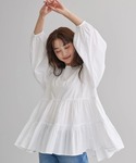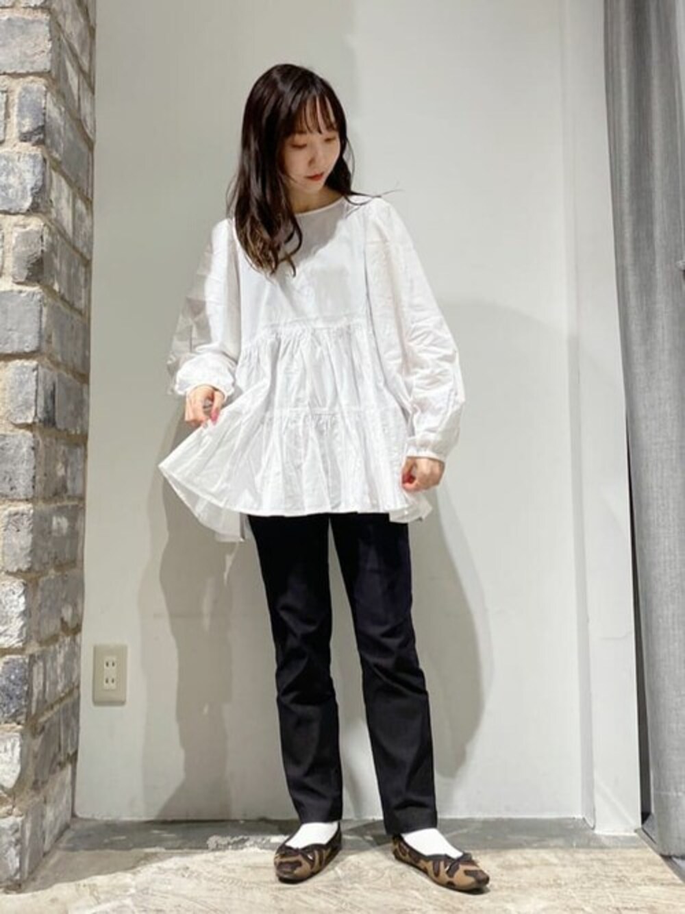 店頭でも大人気のティアードチュニックです。 肩からのボリュームスリーブがガーリーな印象になり可愛いです。 モノトーンで合わせて大人ガーリーコーデに。