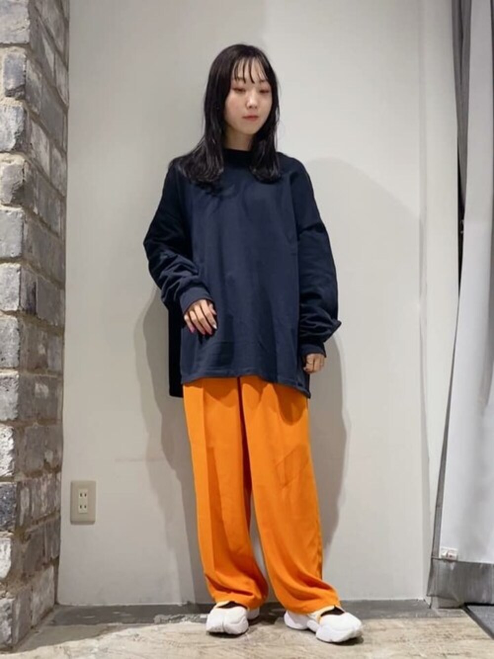 全体的に体のラインを拾わないコーデですが カラーパンツでアクセントをつけました。 パンツは接触冷感のお素材で夏まで活躍してくれるアイテムです。