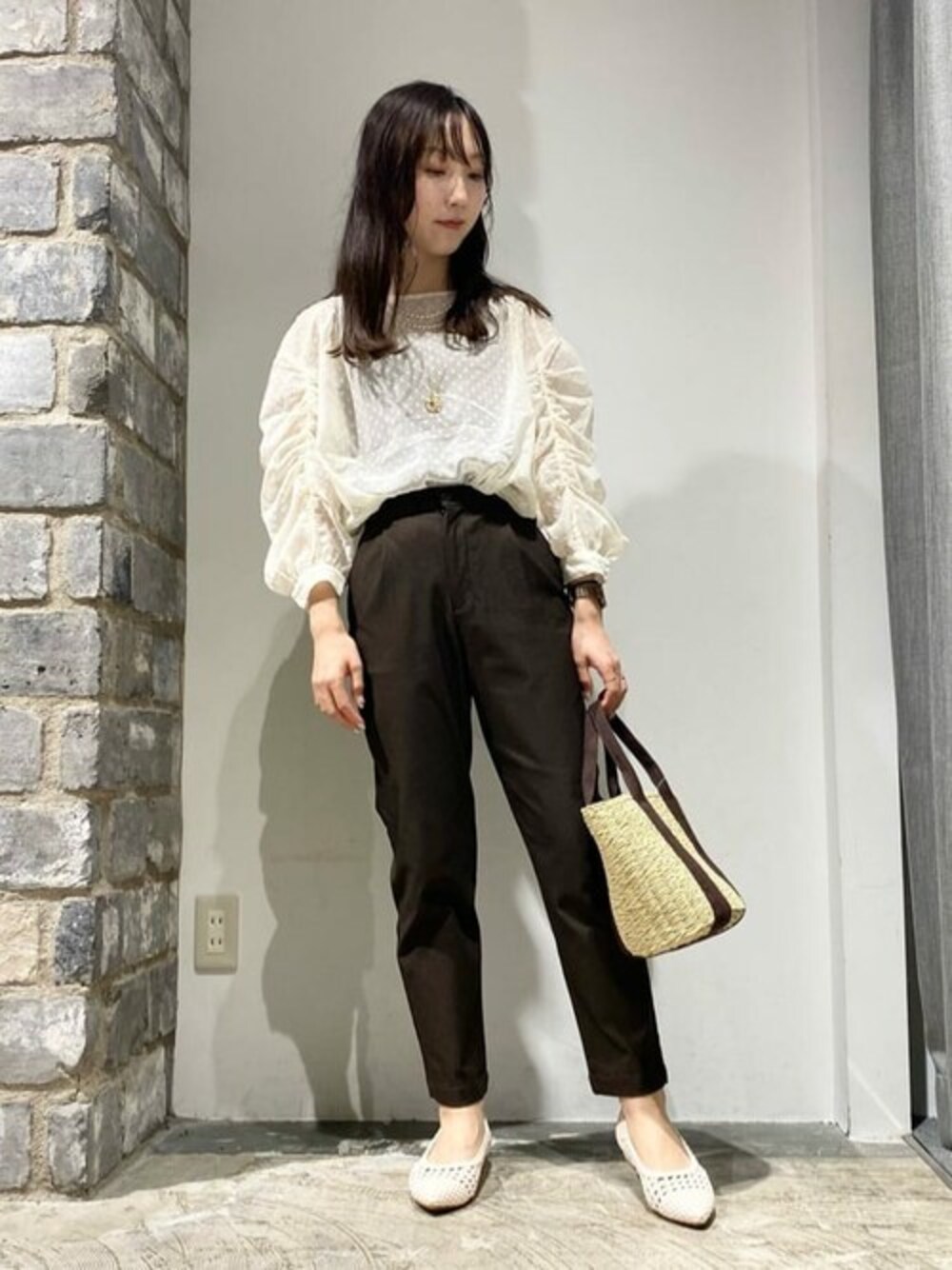 ブラウンとホワイトで統一感を出し柔らかい印象にまとめてみました! カゴバッグは季節感も出るので小物なら夏準備を始めるのがおすすめ! パンツはXS〜Lまでサイズが豊富にあるので手に取りやすいアイテムです。 152cmの私でXSサイズ着用。 くるぶしくらいの丈感になります。