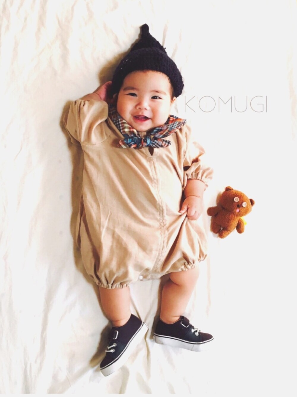 ご覧頂きありがとうございます✩ 本日投稿2回目👀 こちらのロンパースは ハンドメイドアプリ(minne、creema)の出品者、こはるびよりさんの作品です( ¨̮ ) 肩掛けバンダナがおしゃれなロンパースです✩
