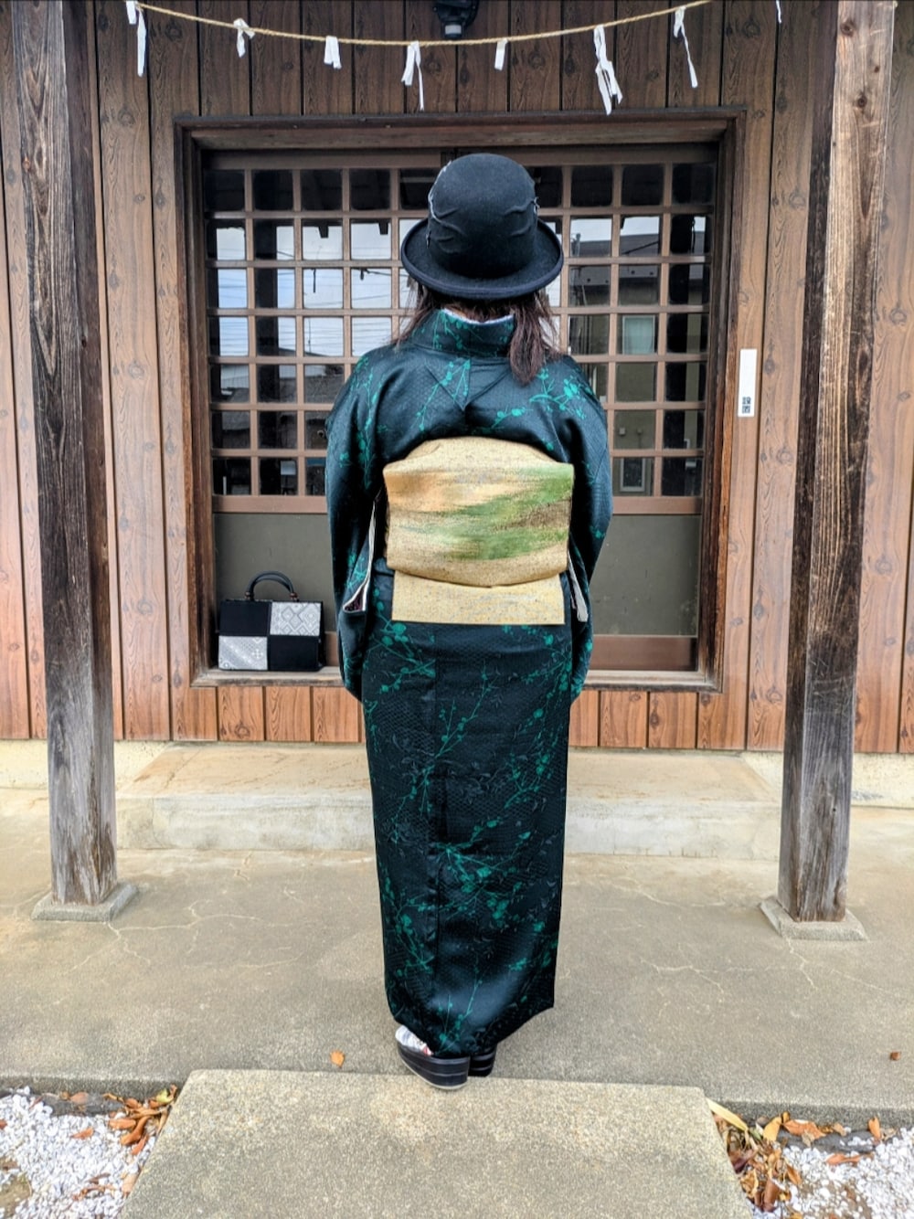 毎年三が日のうち1度は母の梅柄着物を着ると決めています。 今年はベージュの名古屋帯を合わせてみました。 黒×緑をベースに濃いめの色を点々と。 紺、濃紫、パール、ラメ 普段はカジュアル要素強めなので、襦袢に名古屋帯に和装要素強めに組みました。 今年も宜しくお願い致します🙇