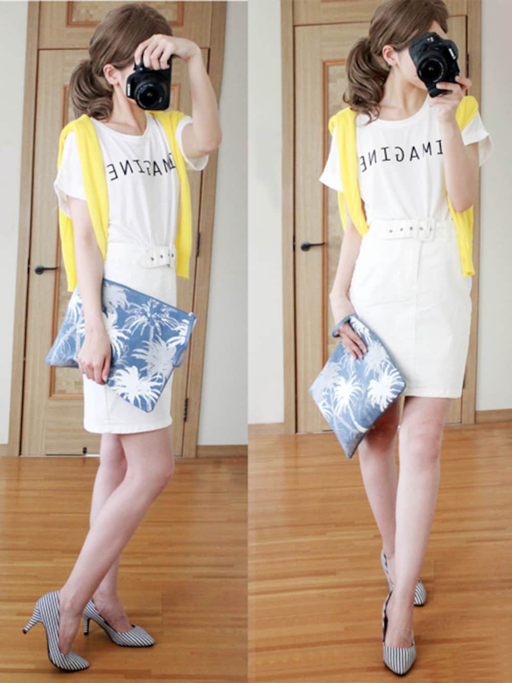 The Secret Beanのホワイトコーデにさし色でイエローのカーディガンをプラスしました*