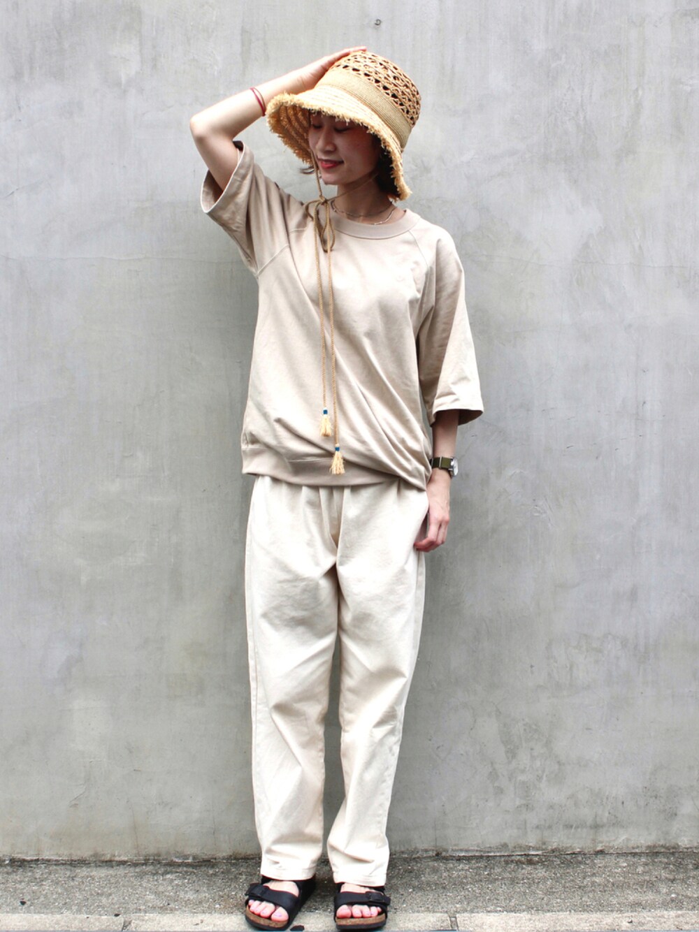 たけむのハット「【OVERRIDE】RAFFIA FRINGE HAT / 【オーバーライド】ラフィア フリンジ ハット」を使ったコーディネート