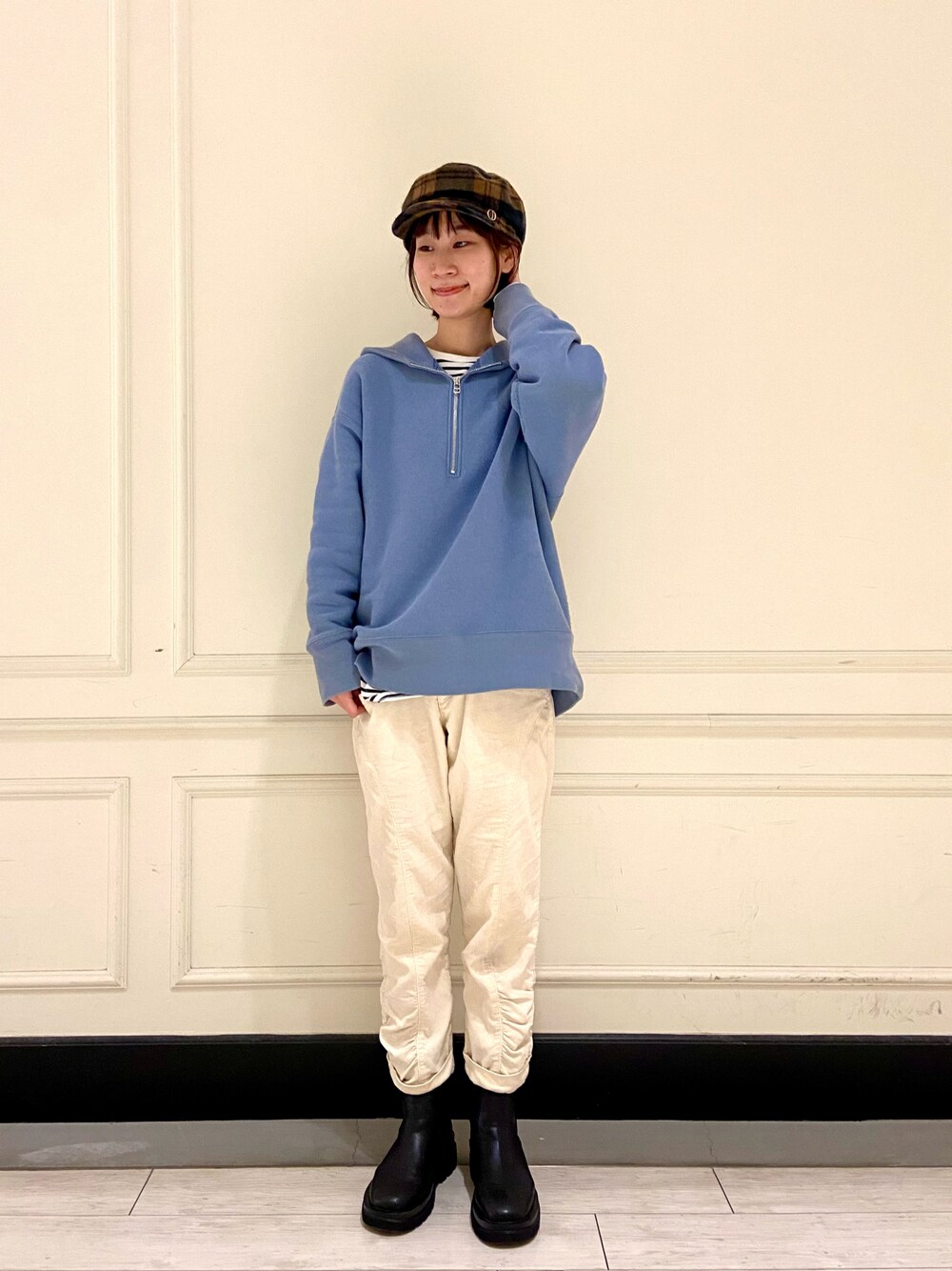 ご覧いただきありがとうございます! いいね、お気に入り嬉しいです♪ ハーフジップパーカーと白パンツのゆるコーデに 落ち着いた色味のチェックキャスケットとショートブーツで大人っぽさを◎