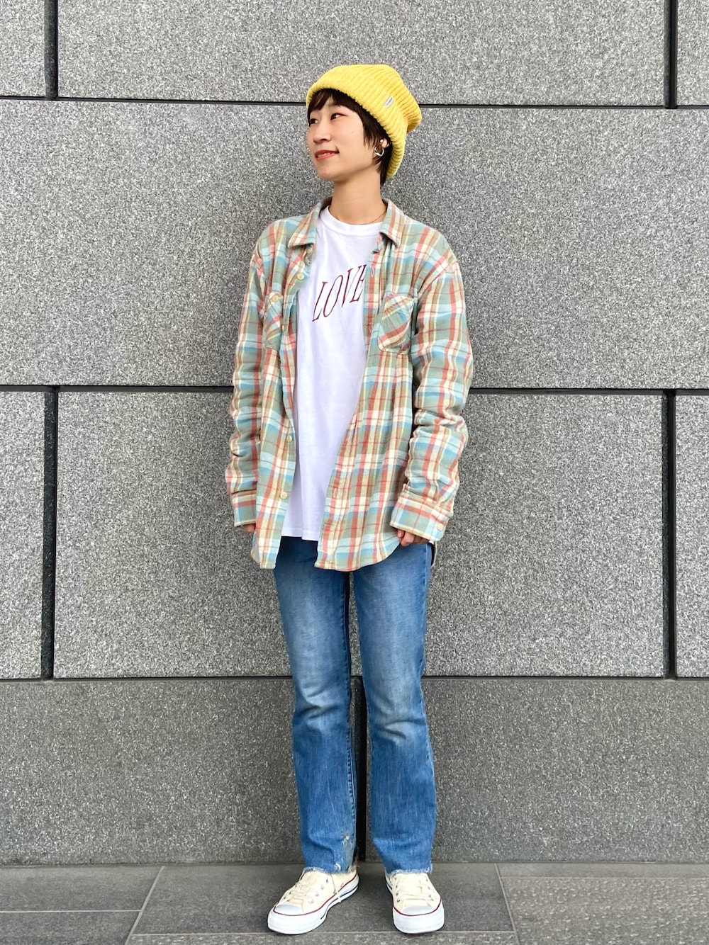 ご覧いただきありがとうございます。 いいね、お気に入り嬉しいです♪ ロンT×デニム×ネルシャツで THEアメカジ〜な感じにエネルギッシュなイエローのニット帽をON🍋 シャリっとした触り心地でルーズなシルエットでゆったり被れます◎