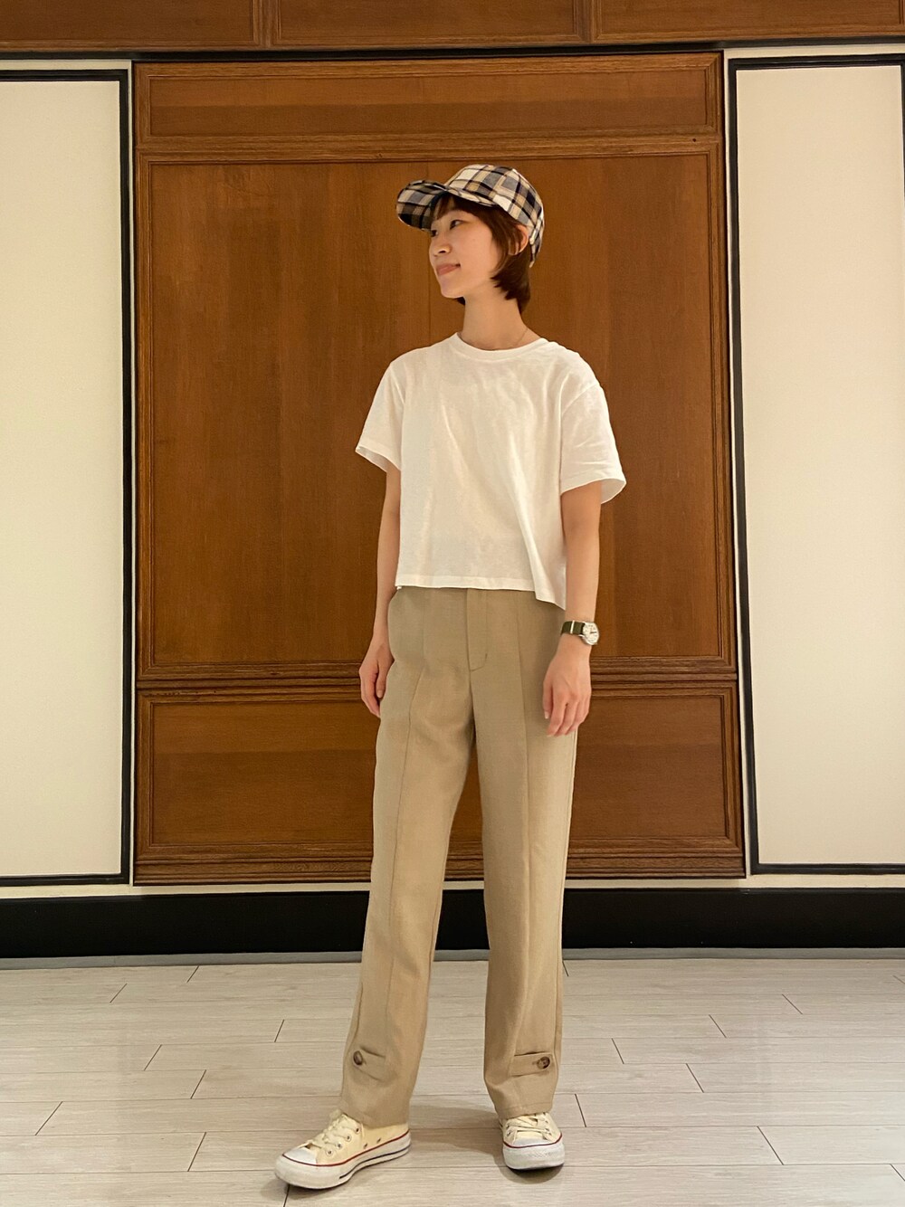 おはようございます。 いいね、お気に入り嬉しいです♪ 今日はすごくシンプルだった日。 気づいたら白T以外はベージュでした😗 チェックのCAPをアクセントに◎