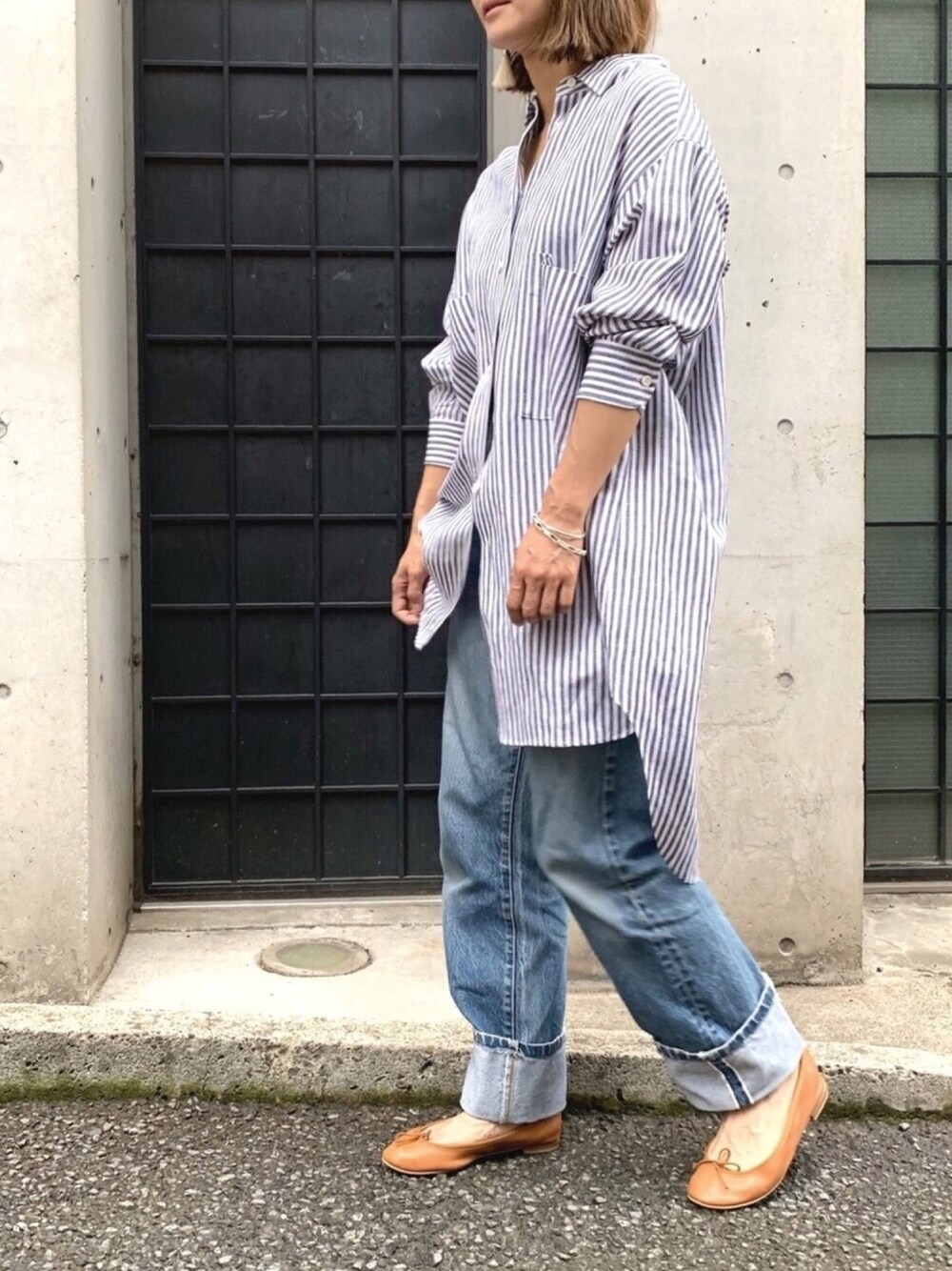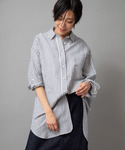 san🦔(Munich)のシャツ/ブラウス「リネンレーヨンストライプビッグシルエットロングシャツ」を使ったコーディネート