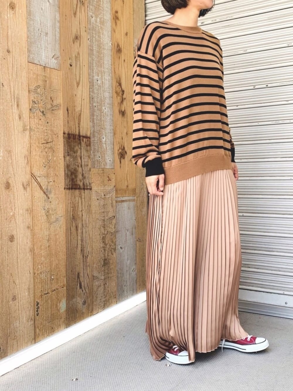 san🦔(Munich)のワンピース「ウールジャージー×サテンプリーツドッキング2WAYニットワンピース」を使ったコーディネート