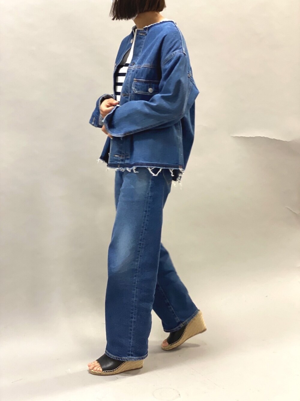 san🦔(Munich)のデニムジャケット「ブリーチデニムノーカラーブルゾン」を使ったコーディネート