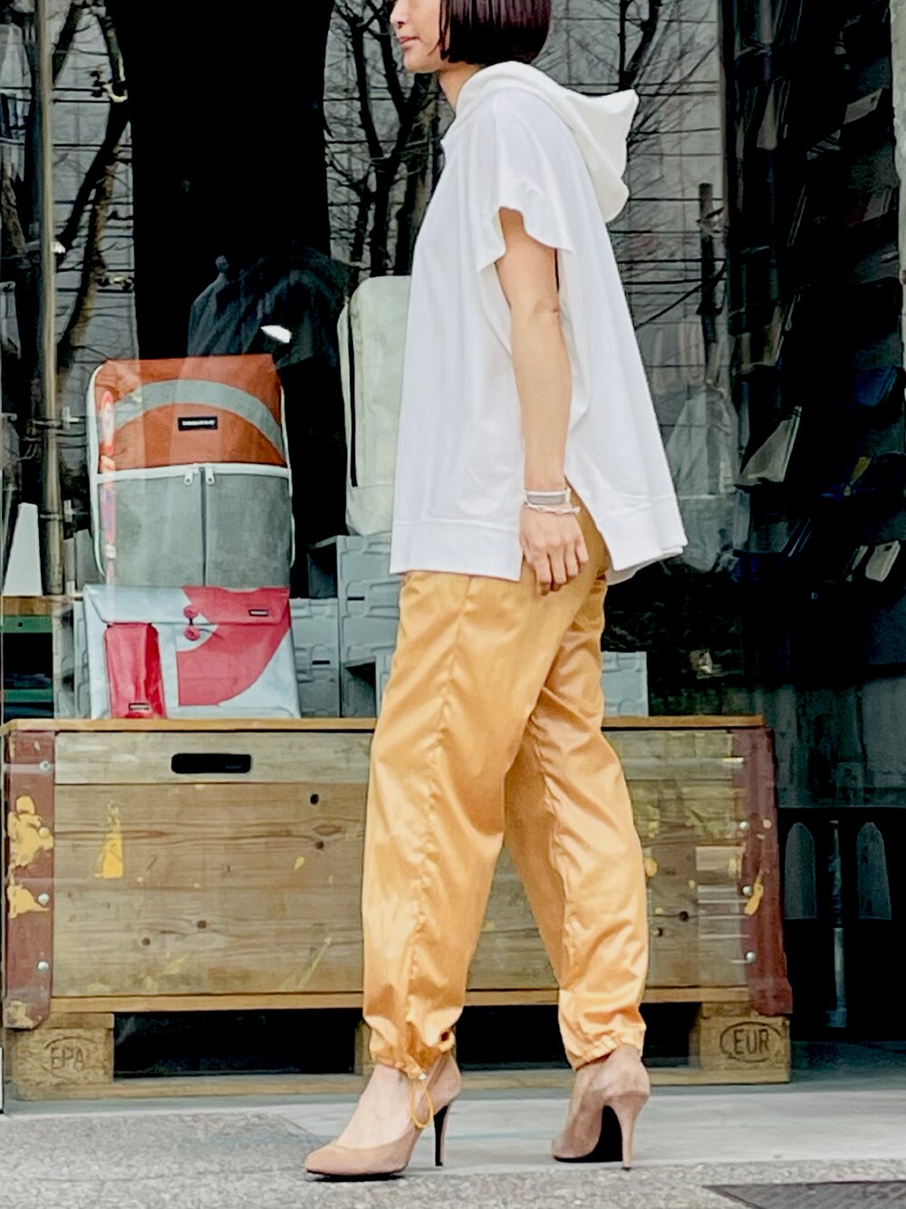 春のテカテカパンツはオレンジ