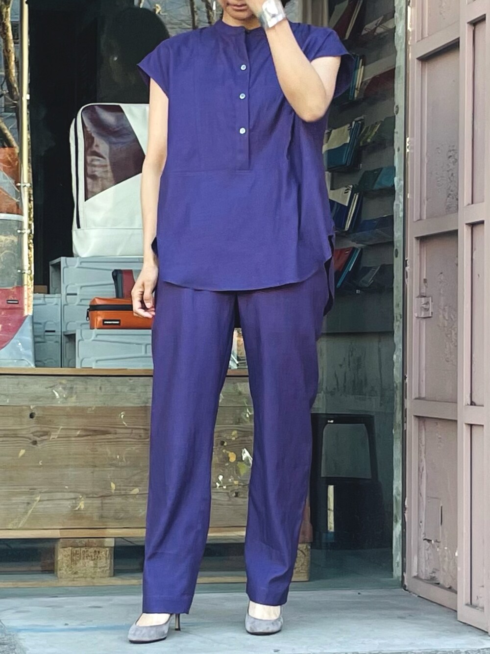 san🦔(Munich)のシャツ/ブラウス「キュプラオーガニックコットンスリーブレスシャツ」を使ったコーディネート