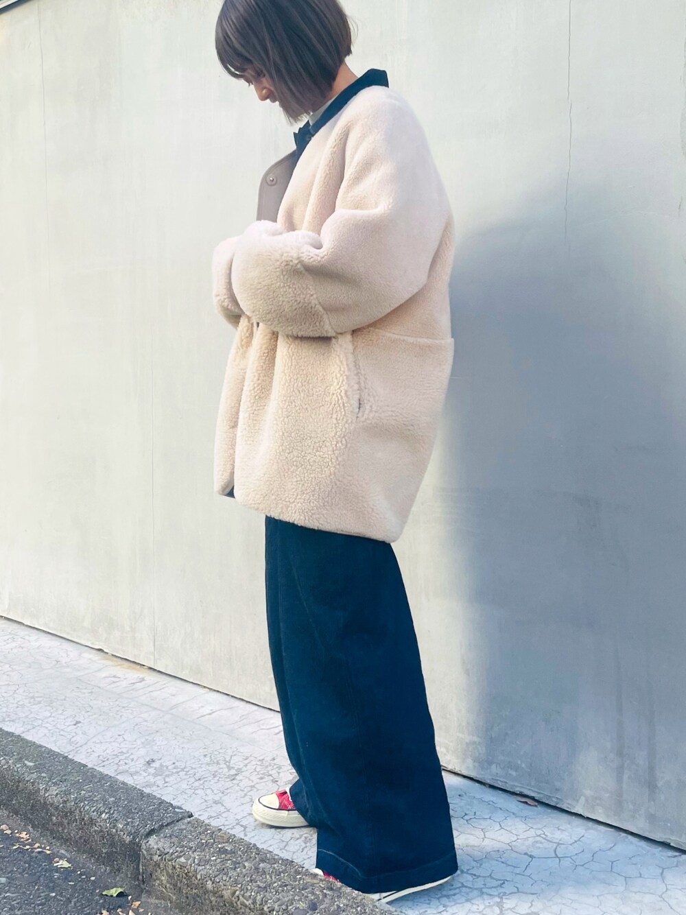 san🦔(Munich)のムートンコート「ウールシープボアムートンリバーシブルノーカラーコート」を使ったコーディネート