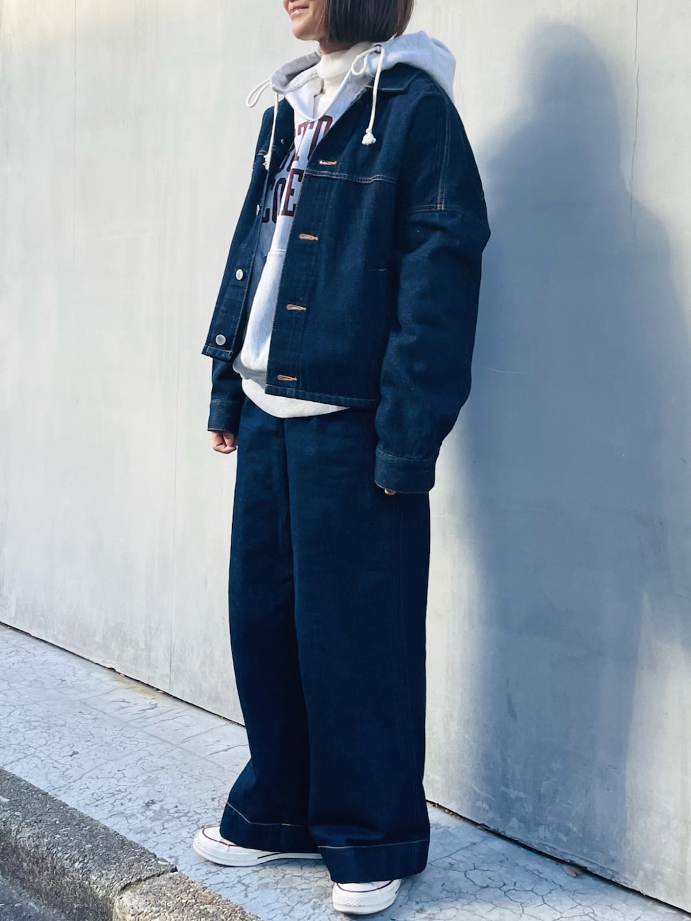 新作のジャケットと定番のパンツ 色が近いのでセットアップ風に着れます