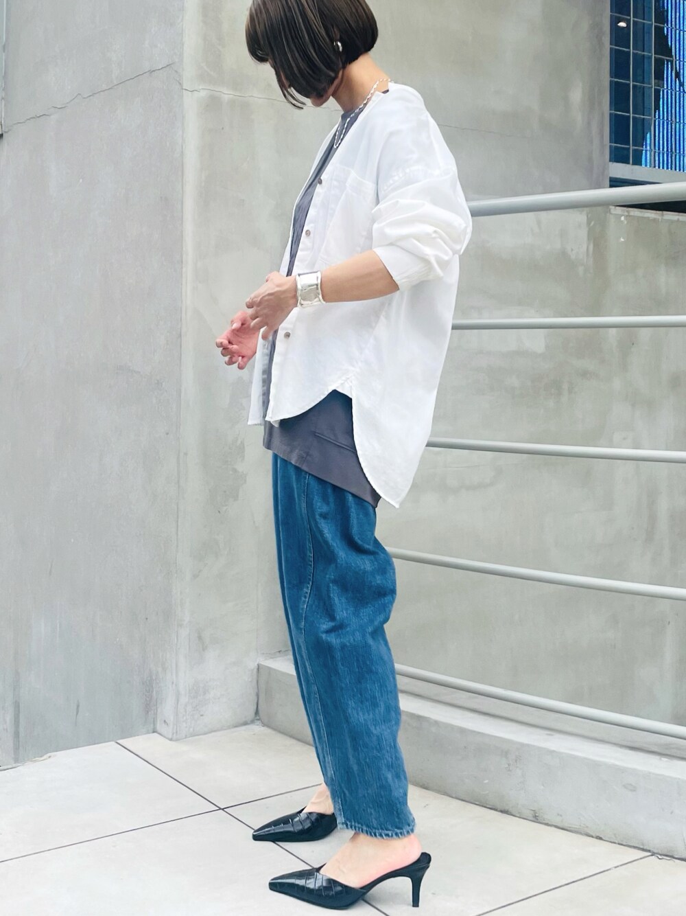 san🦔(Munich)のシャツ/ブラウス「ウォッシュ5.5オンススラブデニムVネックシャツ」を使ったコーディネート