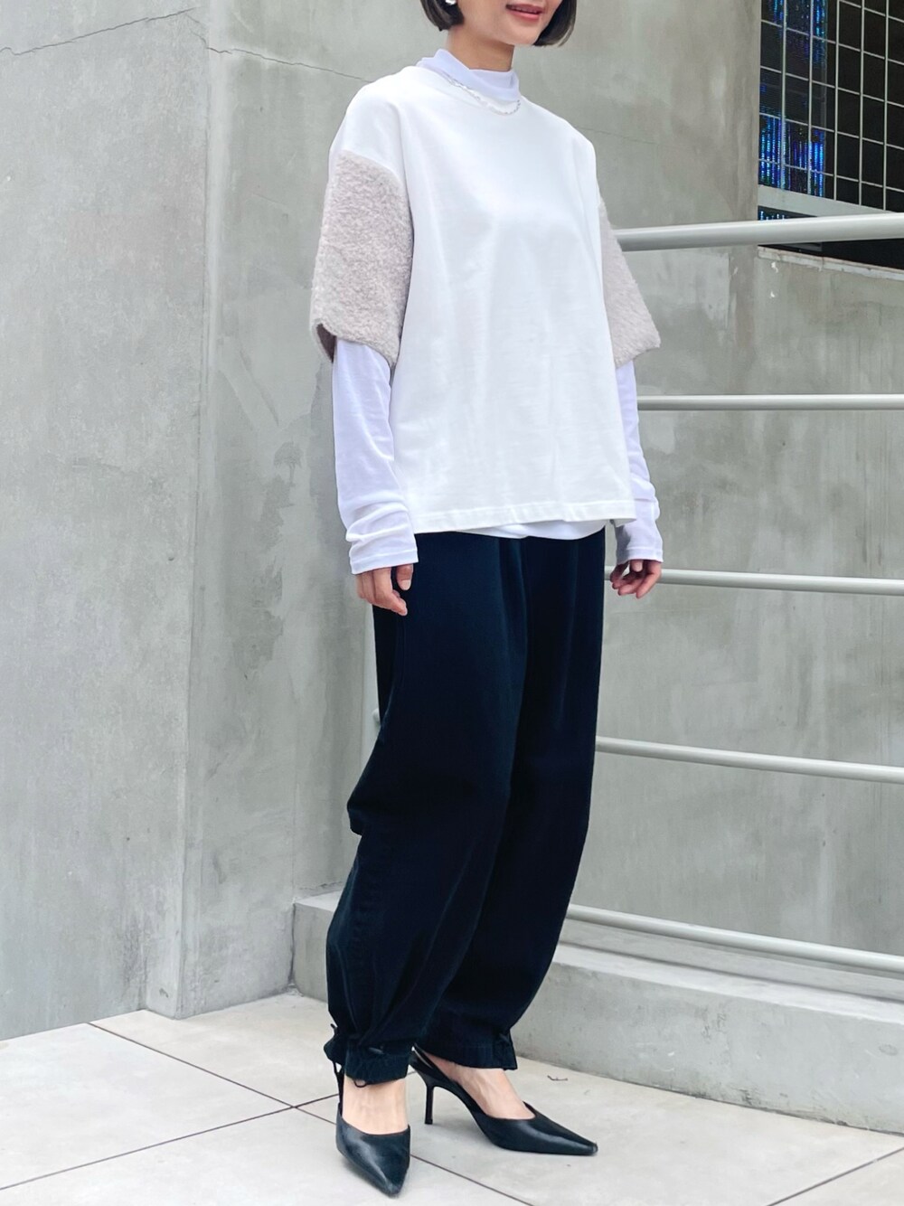 san🦔(Munich)のTシャツ/カットソー「コットンジャージ×ブークレーループニットドッキングTシャツ」を使ったコーディネート