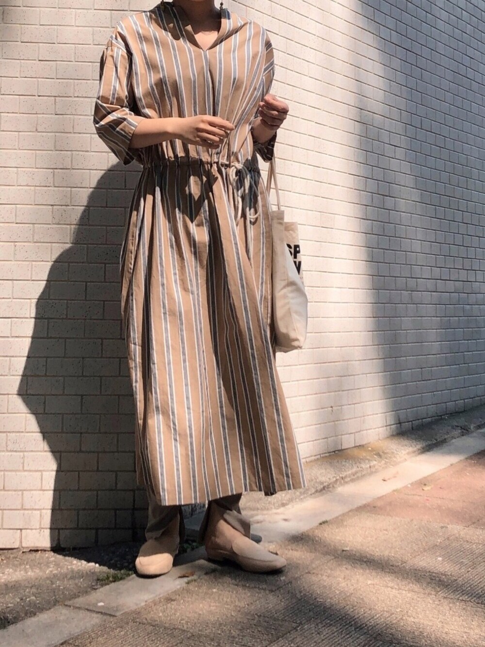 i_munichのワンピース「【4.6ozデニム&ストライプ】ドビードローストリングロングワンピース」を使ったコーディネート