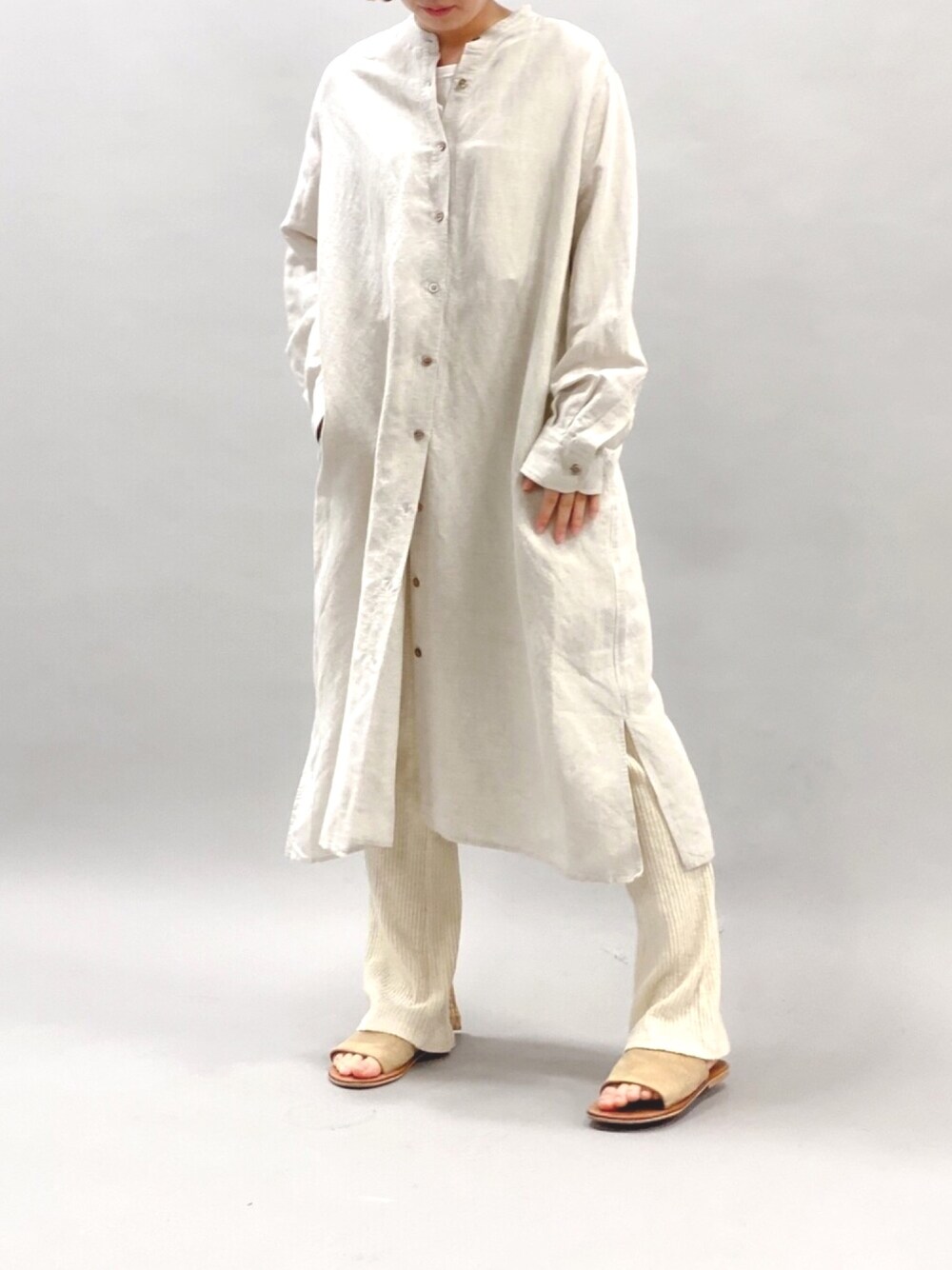 おうちコーディネート4日目🏡 リネンのシャツワンピースはヴィスコース混なので肌触り良く、大人っぽい落ち感のある素材を使用🌱羽織にしてもちょうどいい丈感です👌 リブレギンスは今年らしいフレアシルエット📣 定番アイテムもシルエットが変わるだけでグッと今年らしくなります👏🏻