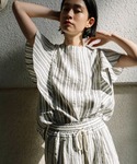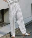 ナチュラルな風合いのストライプをセットアップでコーディネートしました。 フェミニンなデザインもラフな素材が甘くなりすぎず、カジュアルに着こなせます。