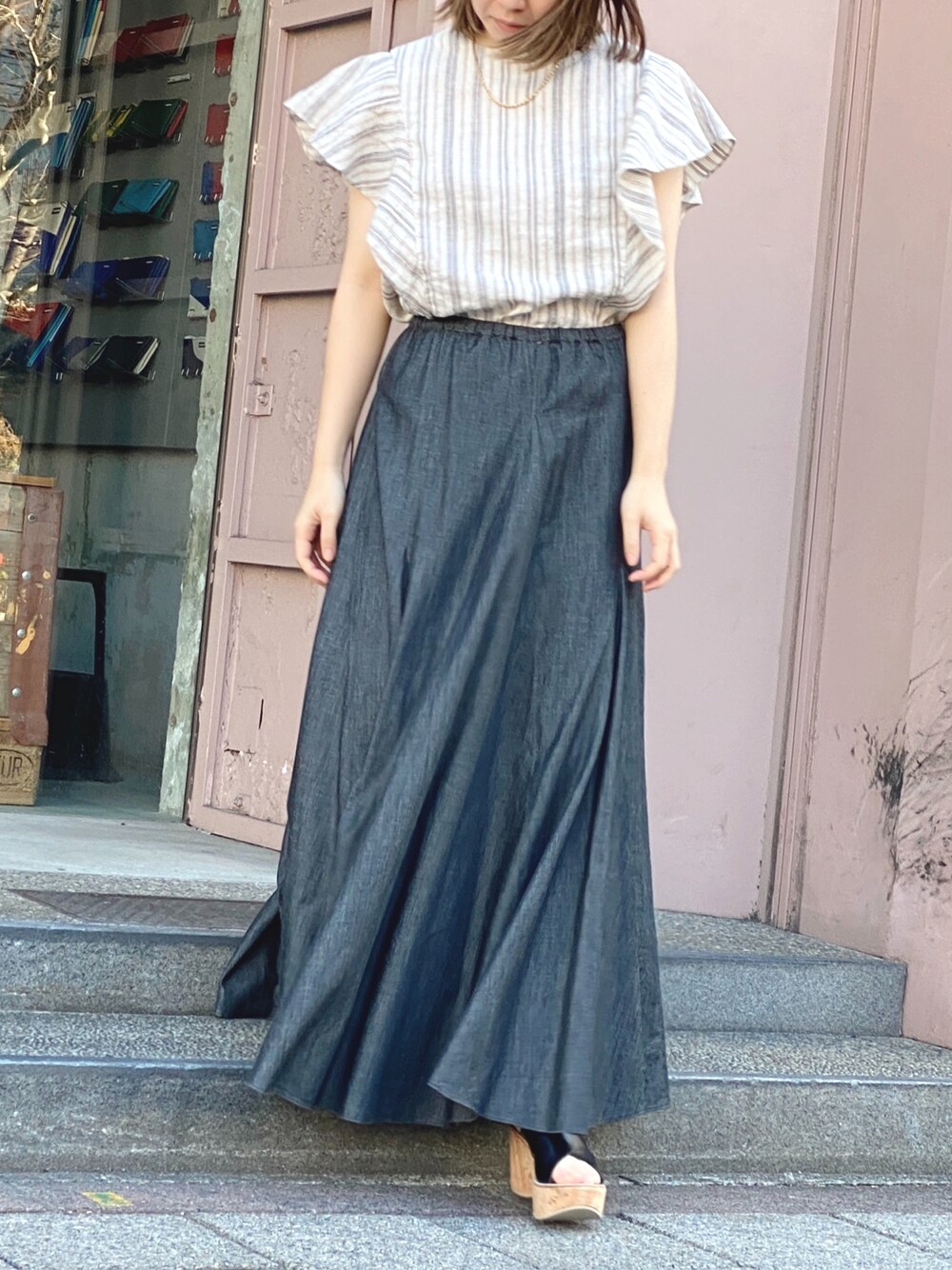 キレイめなデニムのフレアスカートはオールシーズン着まわせるミューニックの人気アイテム。 夏場はブラウスと合わせてスッキリコーディネートするのがおすすめです。