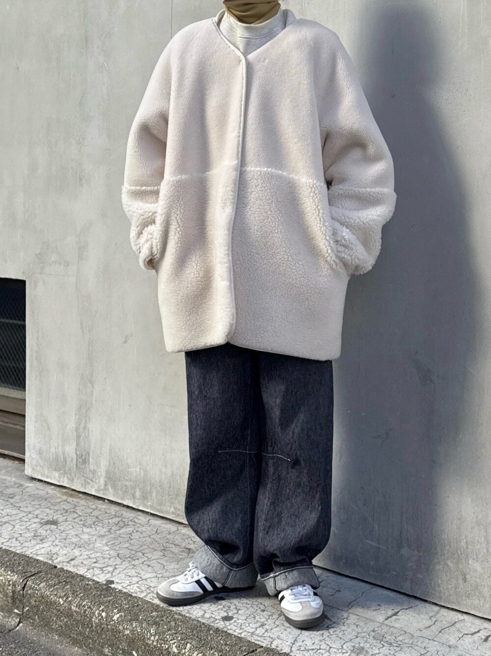 moni(Munich)のノーカラーコート「ウールシープボアムートンリバーシブルノーカラーコート」を使ったコーディネート