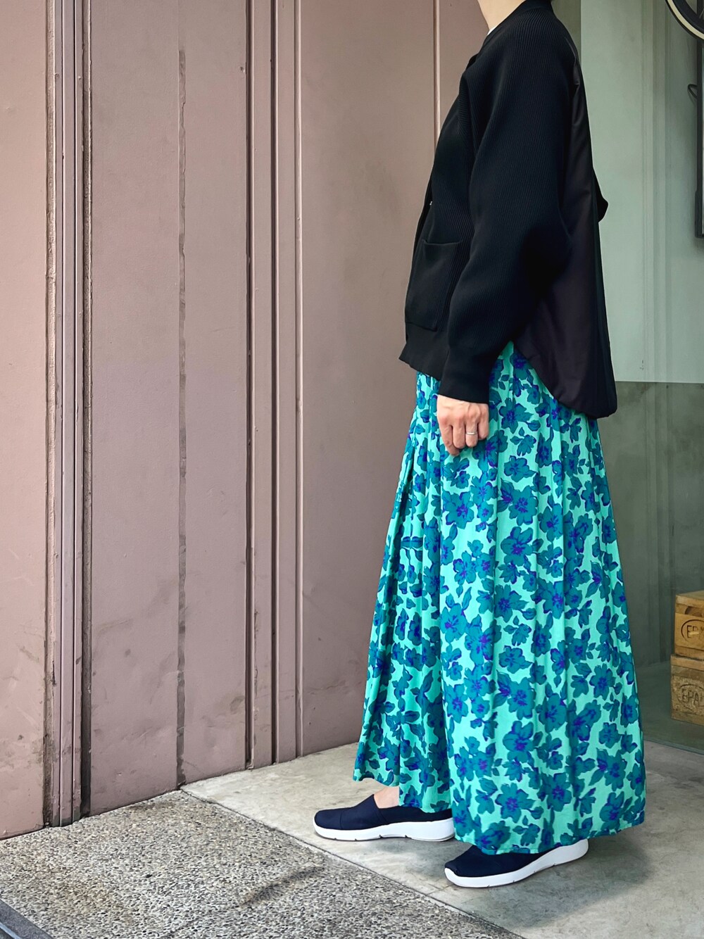 ニットブルゾンとフラワープリントスカートのコーディネート。ブルゾンは後身頃が中綿入りのタフタ素材になっているのがポイント。急に秋の気配。アウターも必要ですね!