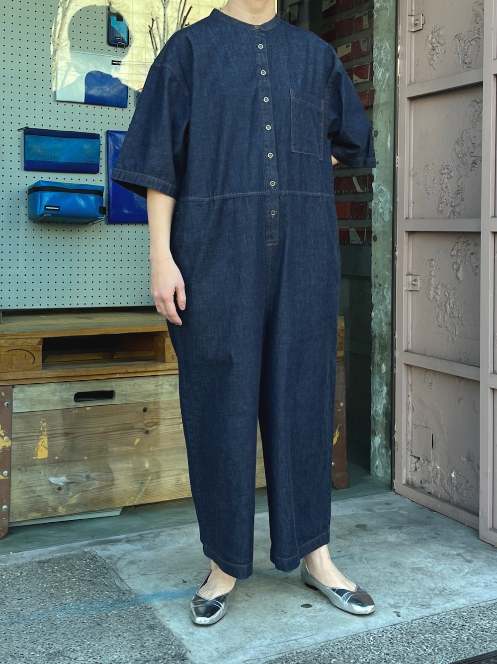 カジュアルなデニムのコンビネゾンも、ワンウォッシュのカラーなら大人っぽく着られます。