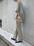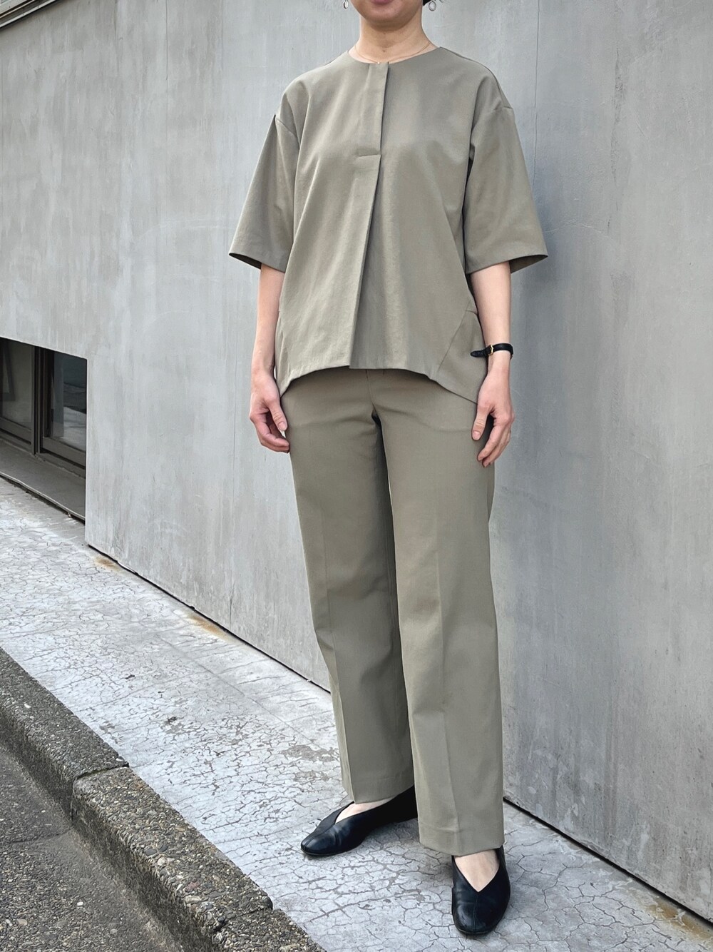 サラッと着られるドライオックス素材のセットアップ。トップスは後ろ側に丸みを入れた、ソフトなコクーンシルエットが可愛いです。