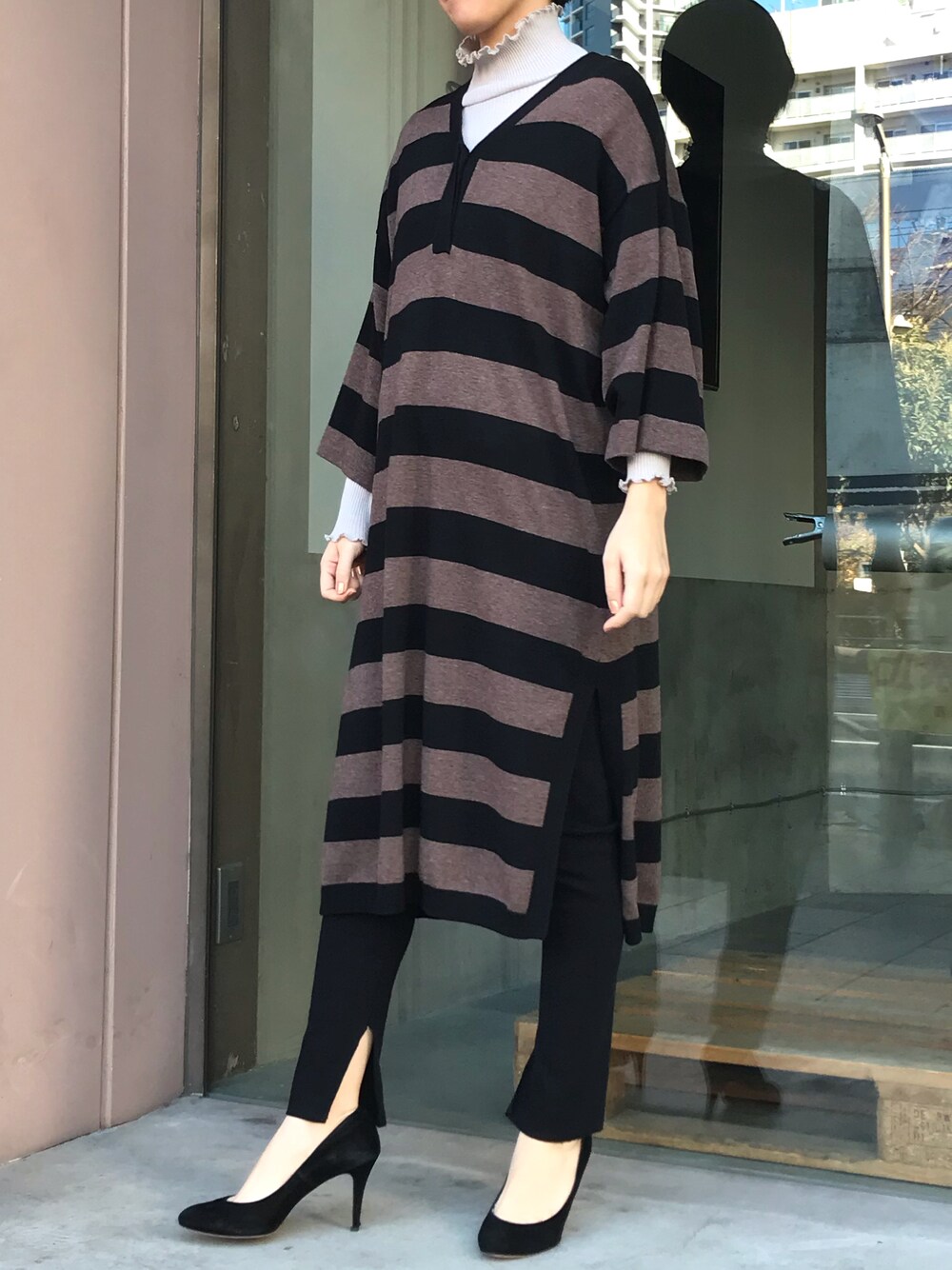 y(Munich)のニット/セーター「レーヨンアンゴラニットボーダー2wayロングプルオーバー」を使ったコーディネート