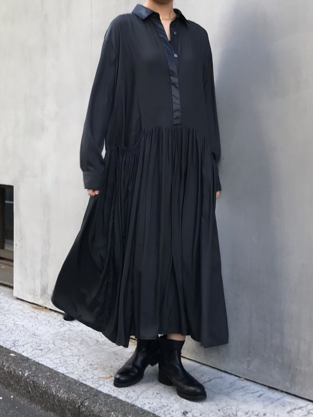 ブラック系のワンピースを着用したレディースの冬コーディネートの1枚目の写真