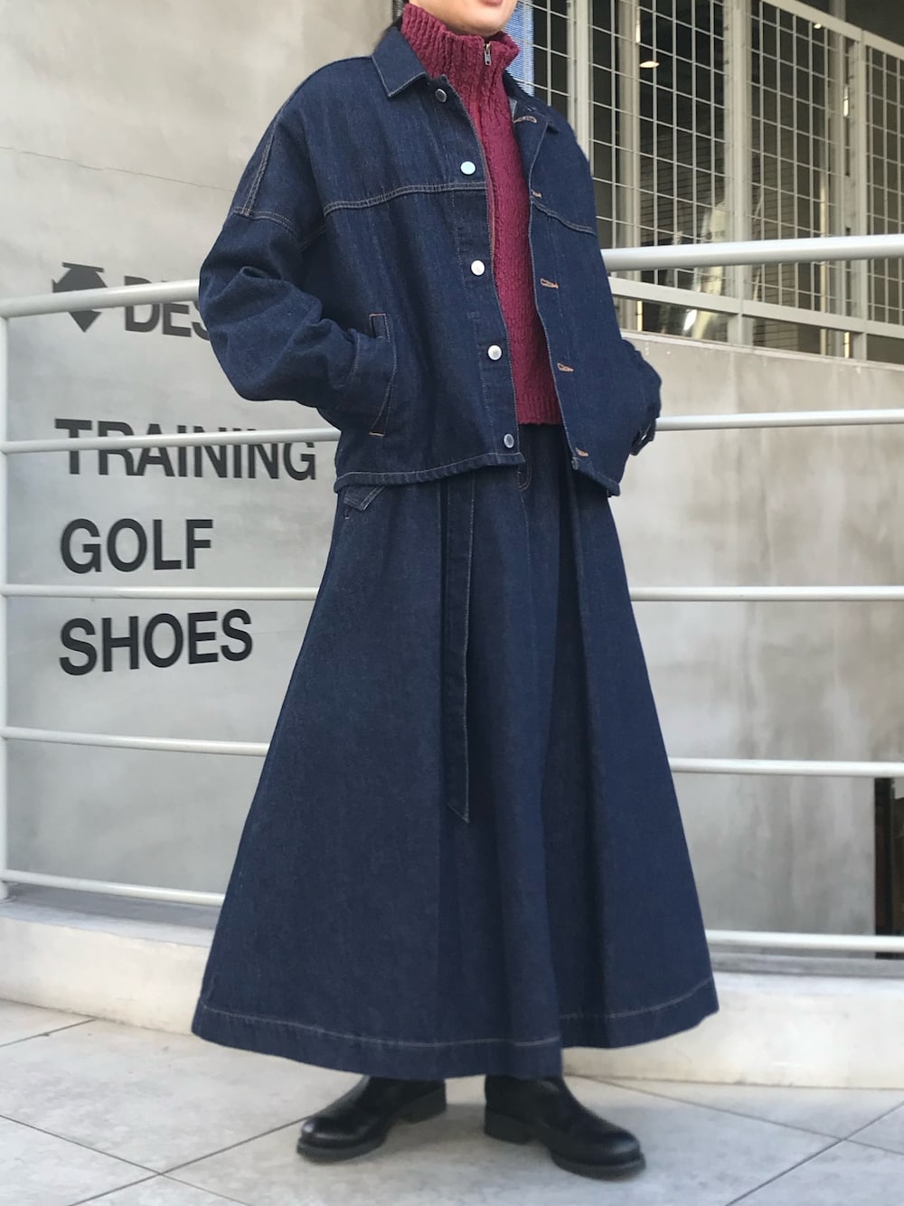 y(Munich)のデニムスカート「10ozスラブデニムベルテッドフレアスカート」を使ったコーディネート