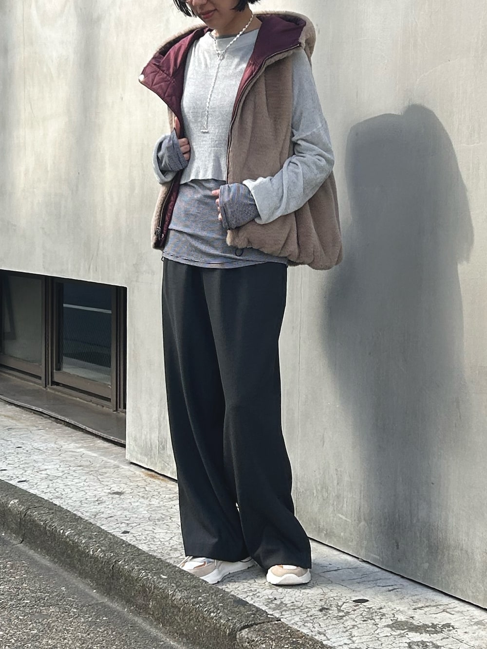 もこもこファーベスト。 ベージュ×バーガンディのおしゃれ配色が素敵♡