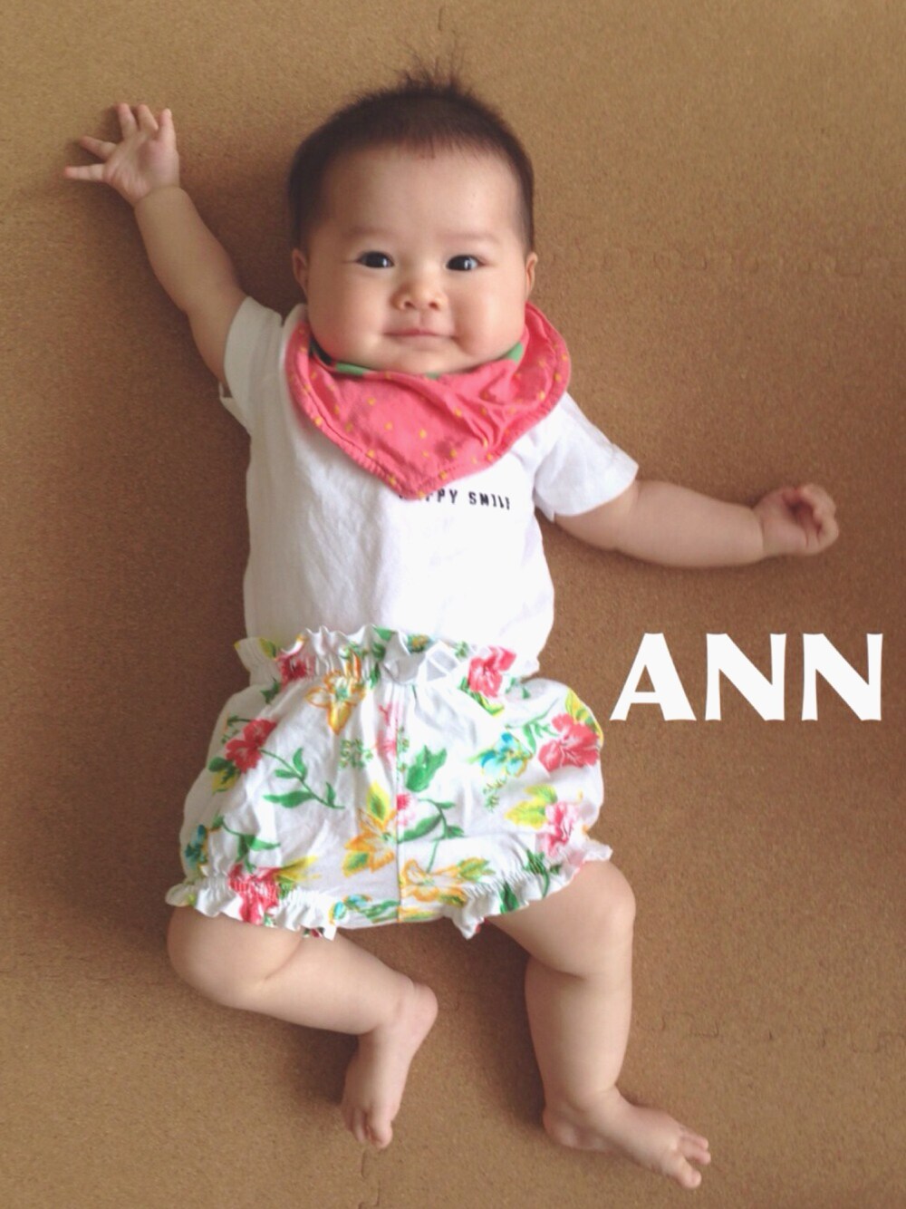 babyGAPのかぼちゃぱんつコーデ❤︎ 夏っぽい柄が可愛い😋ヘビロテ中🌴 お得意のお手上げポーズ\( °∀° )/
