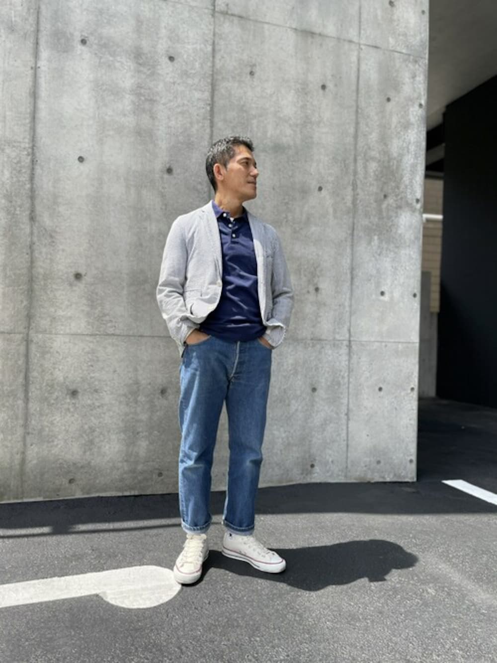 60’s アクションフリーガセットポロシャツ ネイビーをテーマに シアサッカー素材のジャケットとコンバースで カジュアルさを演出。 ザ・アメカジです。