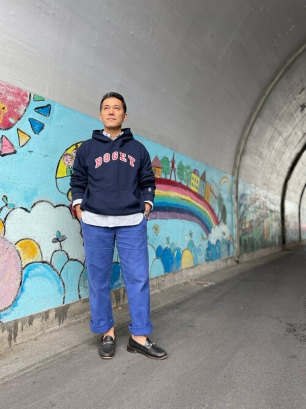 `BOGEY`パーカー MADE IN USA ネイビー×レッドとの黄金比バランスは最高です。 使えば使うほどプリントがかすれていき アメリカ製ならではの楽しみがあるパーカーですね。 足元はタッセルローファーでキレイめも忘れずに!