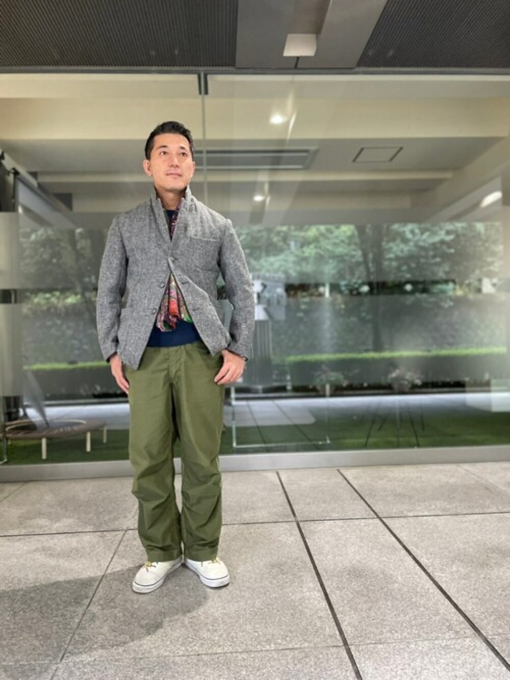 ジャケパンにはミリタリーで。 差し色でETROのスカーフを入れることで 全体を引き締まった雰囲気にしてくれます。 インナーにはスウエットで合わせることで ジャケット脱いだ後のバランスも良きです。 革靴でもよいですが スニーカーでカジュアル感をプラスしています。