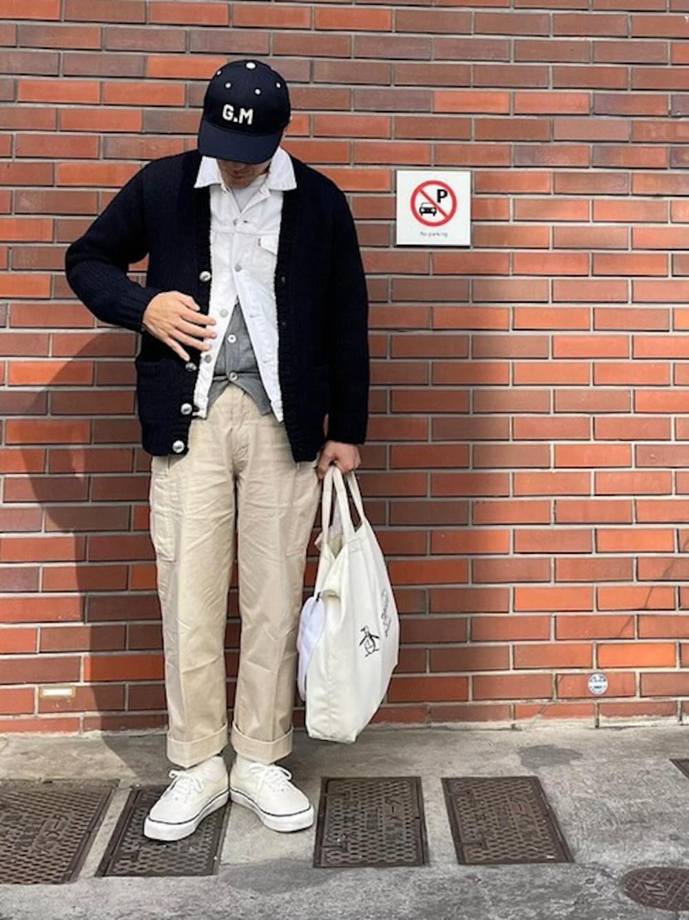 ~3カラーコーディネート~ セーターはアウターとしての役割もOK ●トップス、シューズ、小物はカラーを揃えるのがポイント! ●ベージュのパンツはミリタリーに変更してちょい悪に ●ネイビーはアクセントに、一つから二つぐらい取り入れるのが丁度良い! ●足元は革靴でもOK