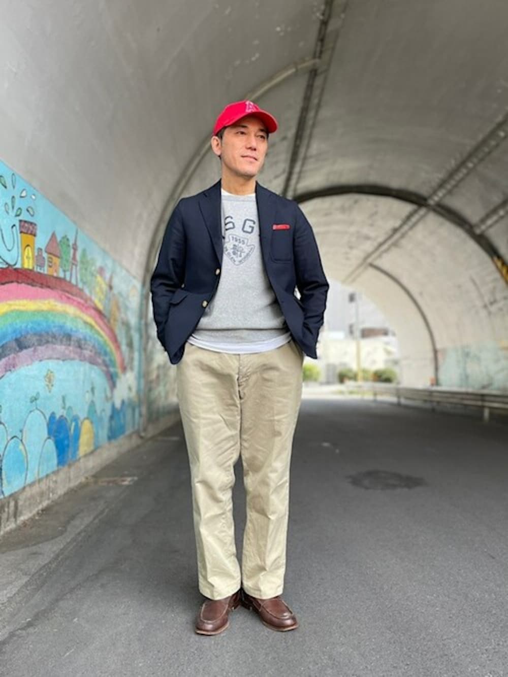 ~レッドキャップ~ 差し色は2アイテムで調整です。 ●ハンカチーフとキャップの色味で全体のカラーバランスにめりはりを ●紺ブレにはベージュのチノパンが王道です ●足元はブラウンを取り入れアメリカンクラシックに ●MLBキャプで遊び心を ザ・オトナカジュアルですね。