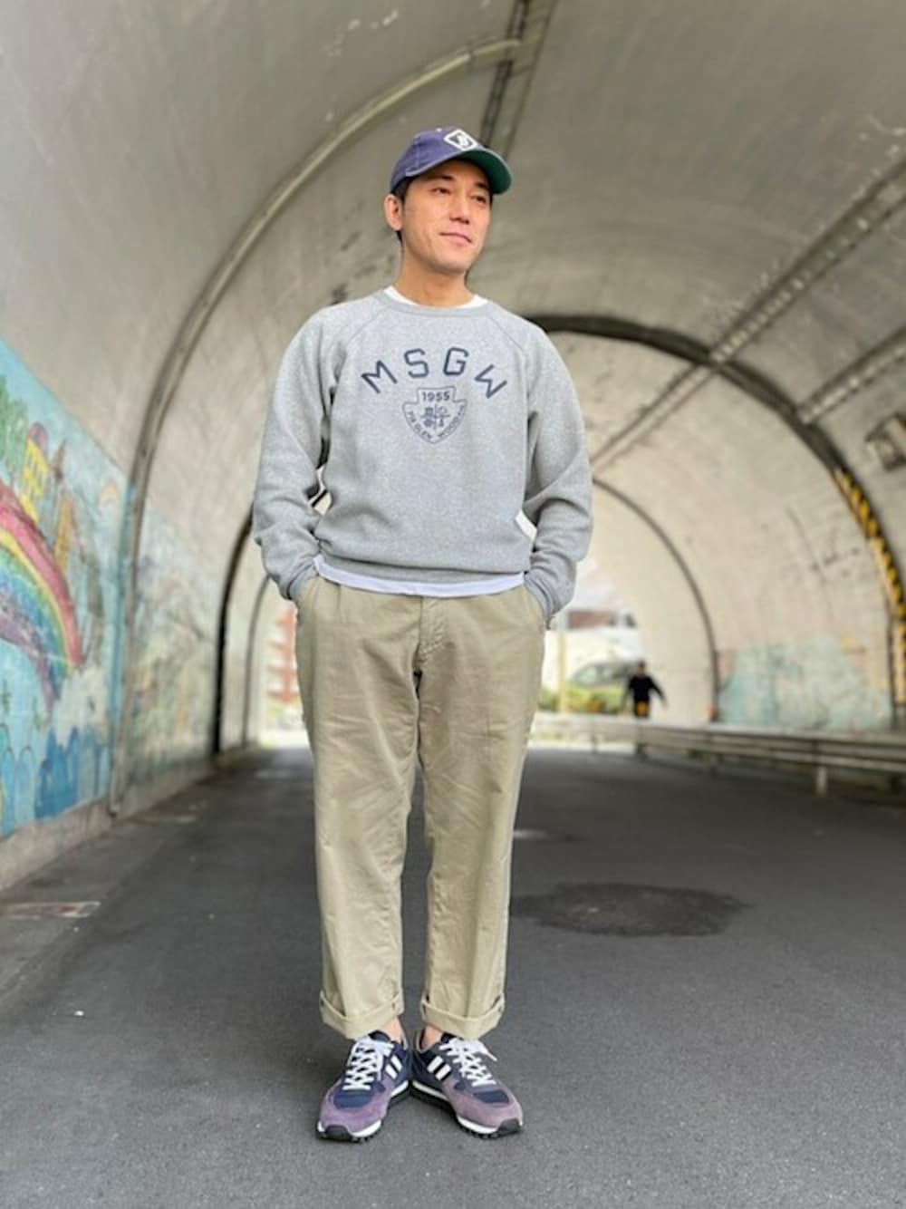 ~春先~ ベースの色味はアースカラーで ●キャプとスニーカーは色味が近い色を!同じはNG! ●グレースウェットからでるチラ見のTシャツは白が良きです ●チノパンもジャストより少しオーバーサイズ感が今の雰囲気に◎ ロールアップの幅は短くがおすすめです♪