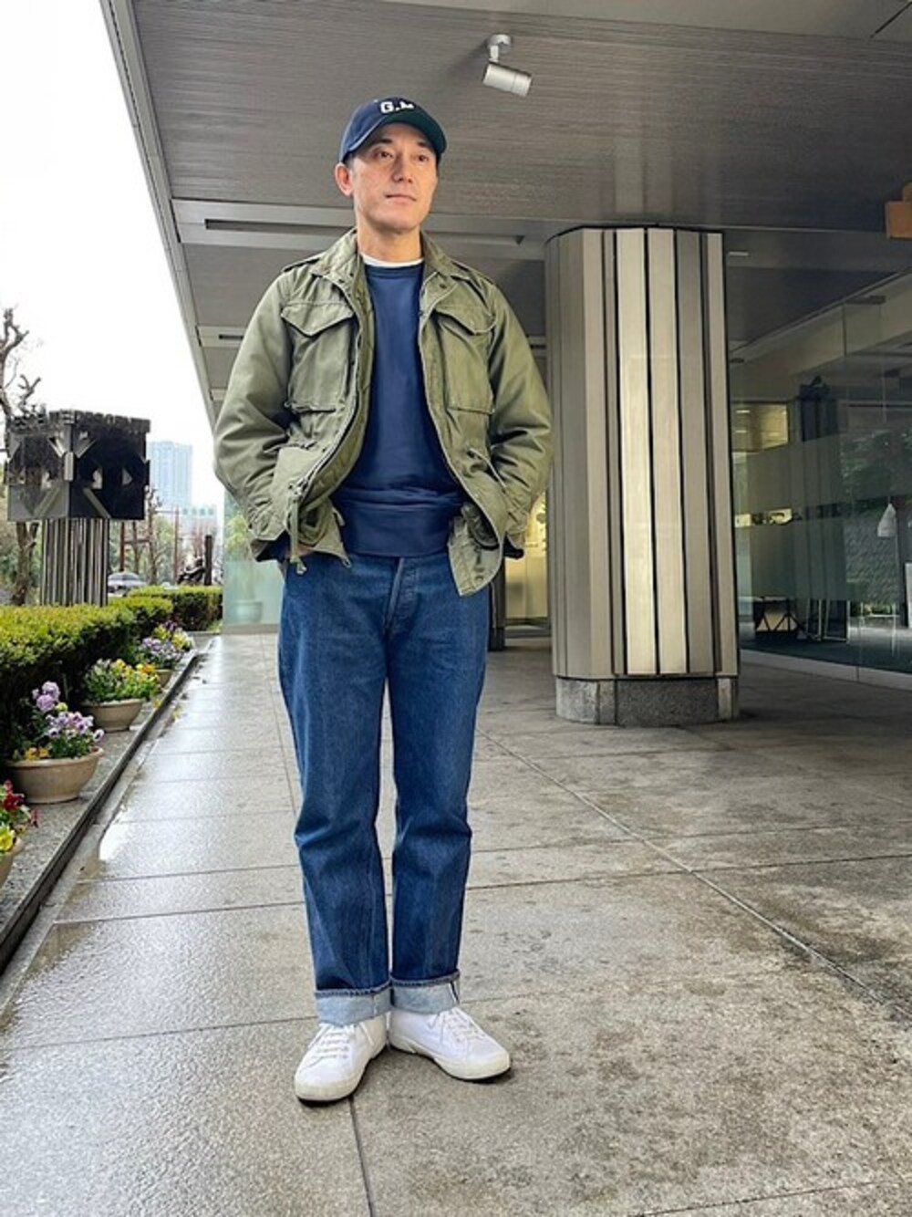 ~雨の日コーデ~ ネイビーで統一 ●ネイビーで統一には足元はホワイトのバランスが◎ ●ミリタリージャケットは少し大きめもおすすめ ●スニーカーとのバランスはロールアップで差別化を 雨の日だからこそネイビーを品よくアメカジスタイルで乗り切ろう!