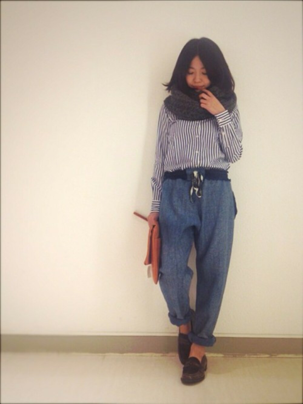 仕立てのいいシャツをスウェットパンツにインしてスポーティにコーディネート♪ 寒い日はスヌードが欠かせません!