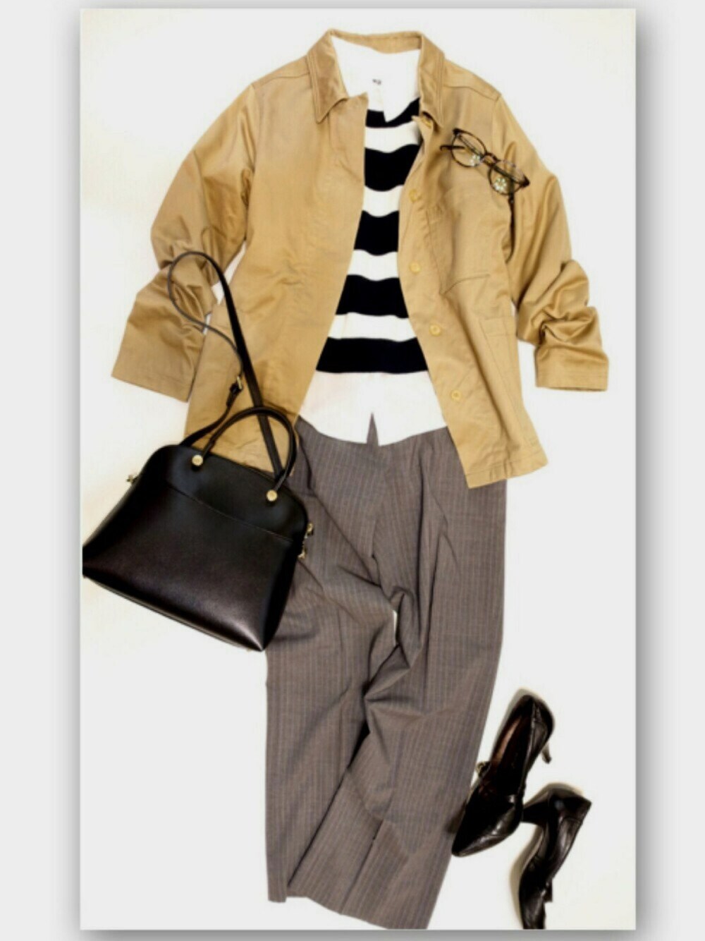 ベージュジャケットの春コーデ🌸 ベーシックなアウターですが、インナーも白シャツ・ボーダー・グレーパンツのベーシックアイテムだけでコーディネートしてます。