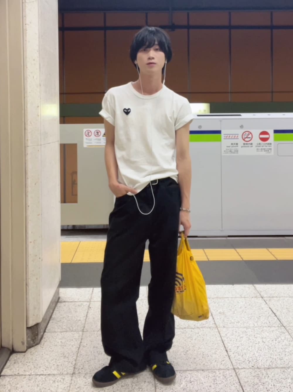 夏はシンプルになりがちだからこそ 色物で遊ぶに限る!! 全体的にモノクロでまとめながら、黄色の差し色を小物に落とし込むことで、こなれ感を演出!!